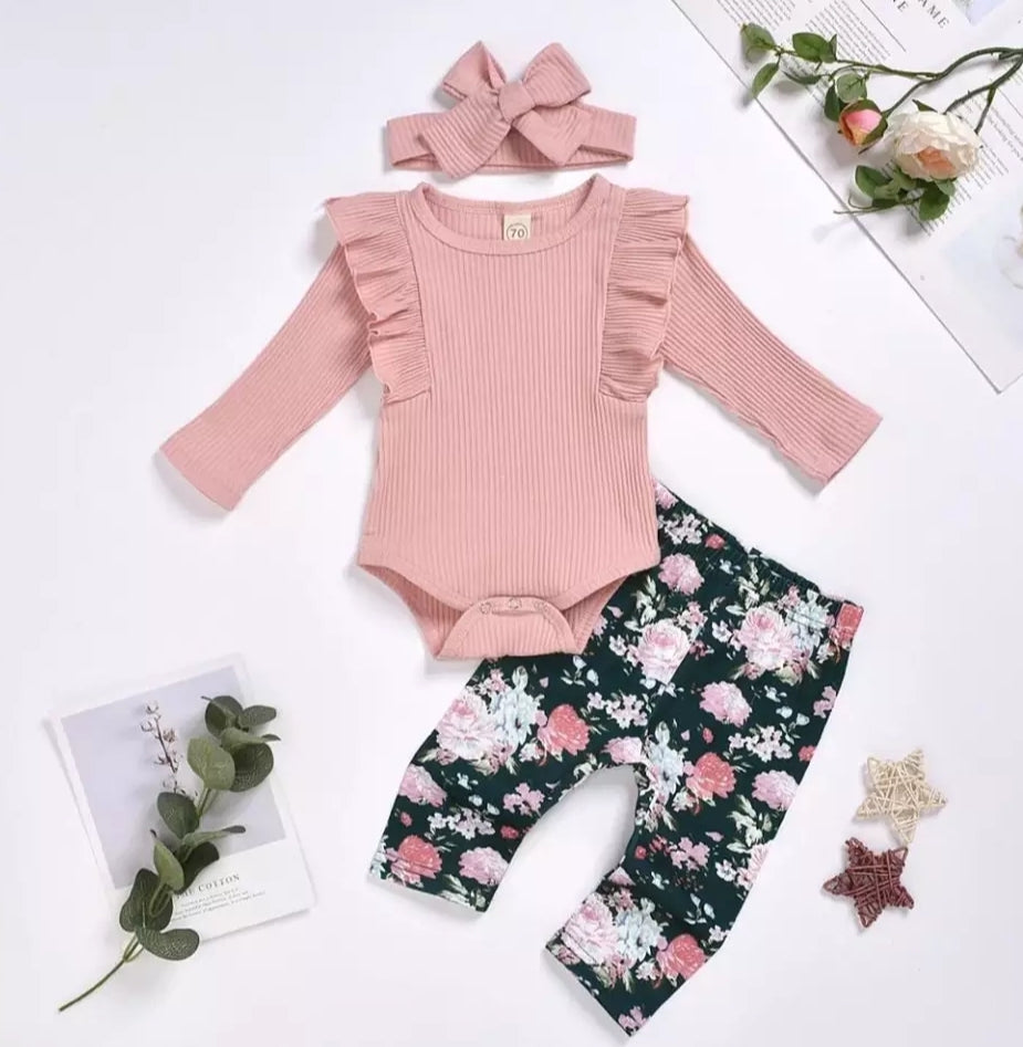 Ribbed Dusty Pink Ruffle Romper with Floral Leggings and Headband