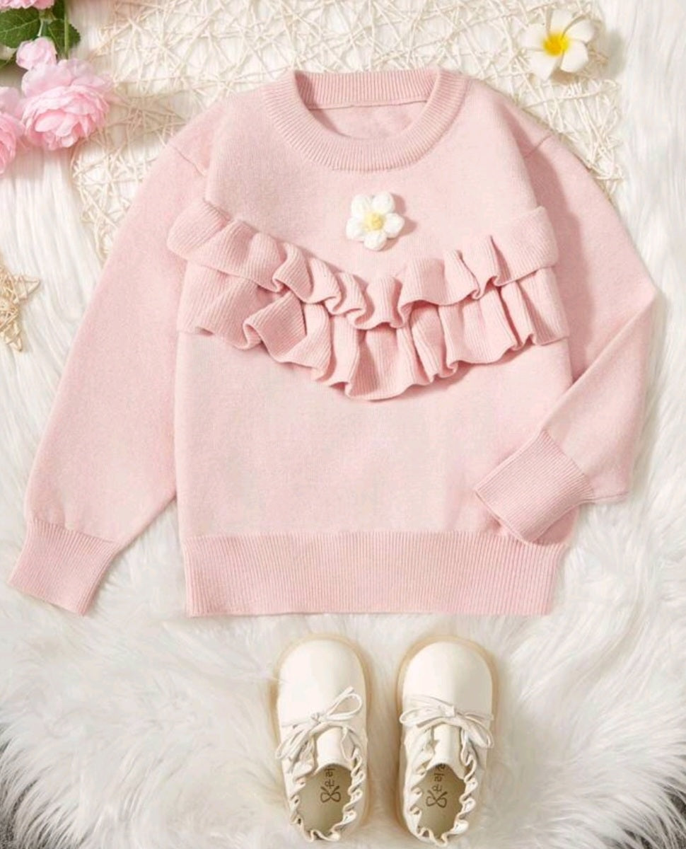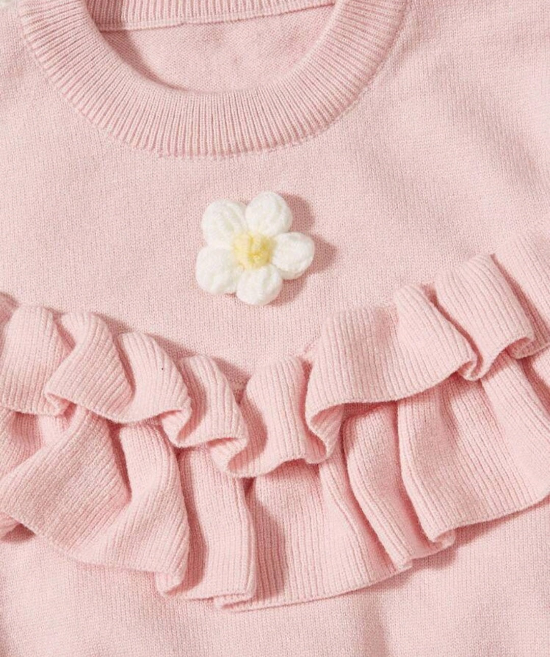 Pink Ruffle Trim Sweater with Floral Detail #1000230