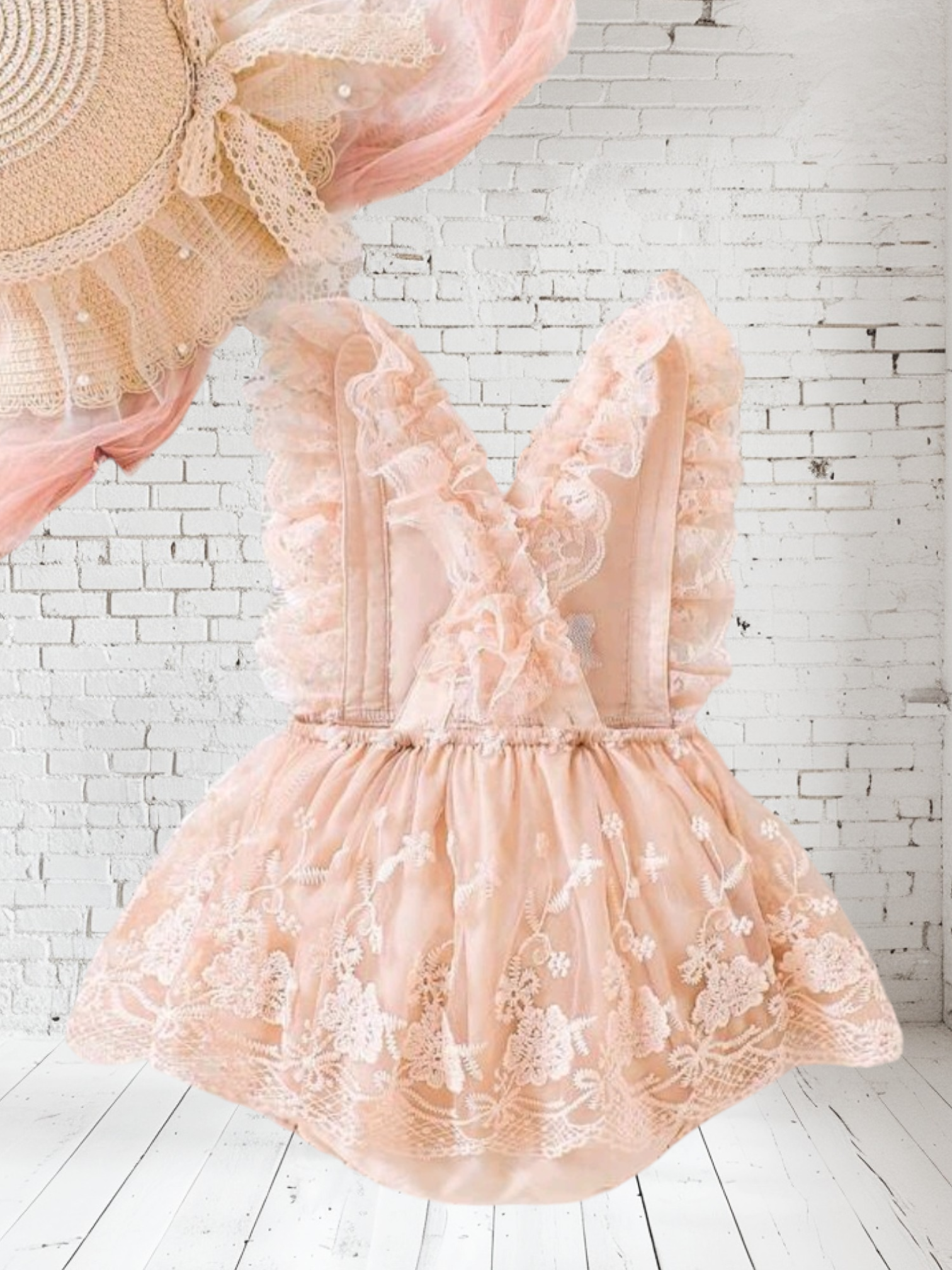 Peachy Pink Romper Dress with Embroidered Mesh Overlay