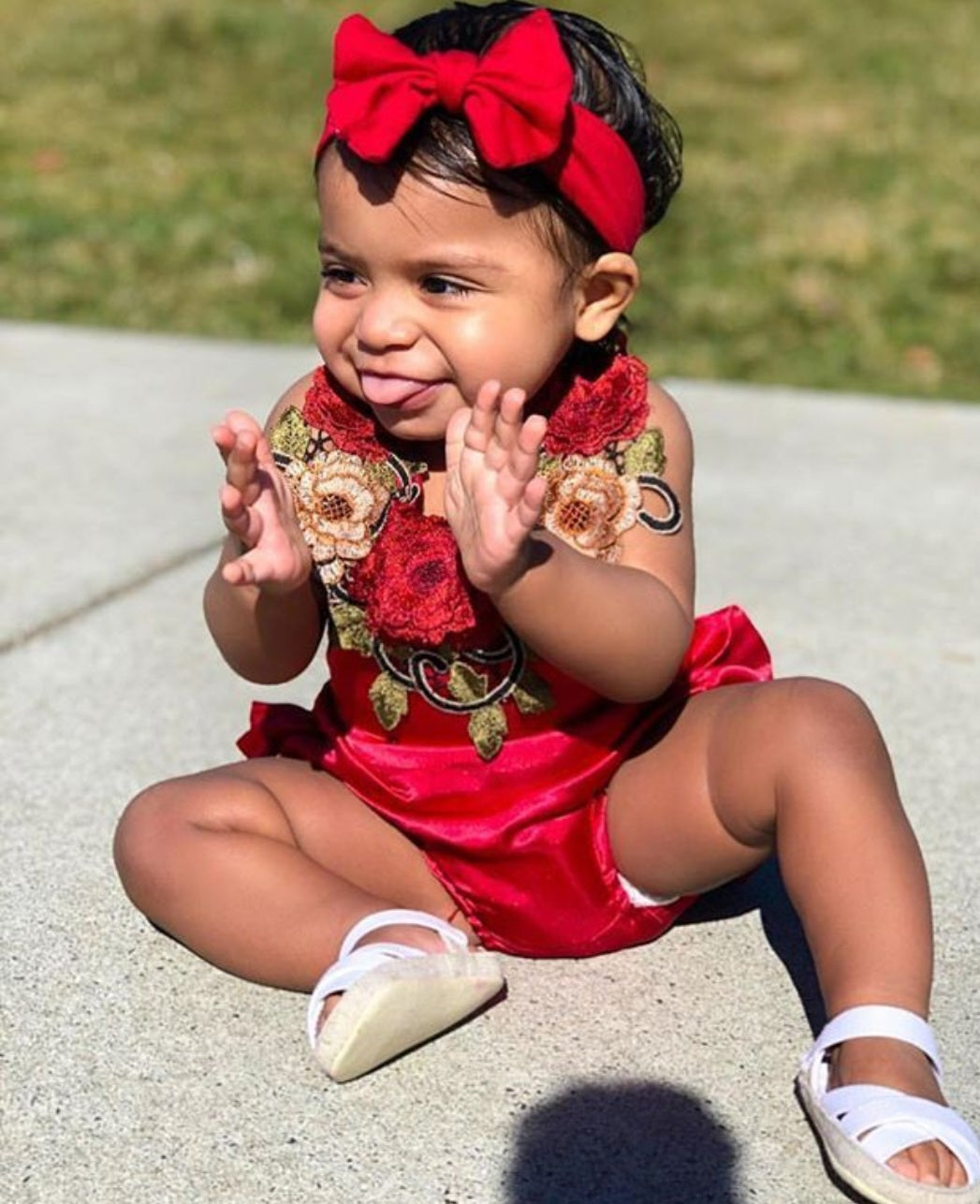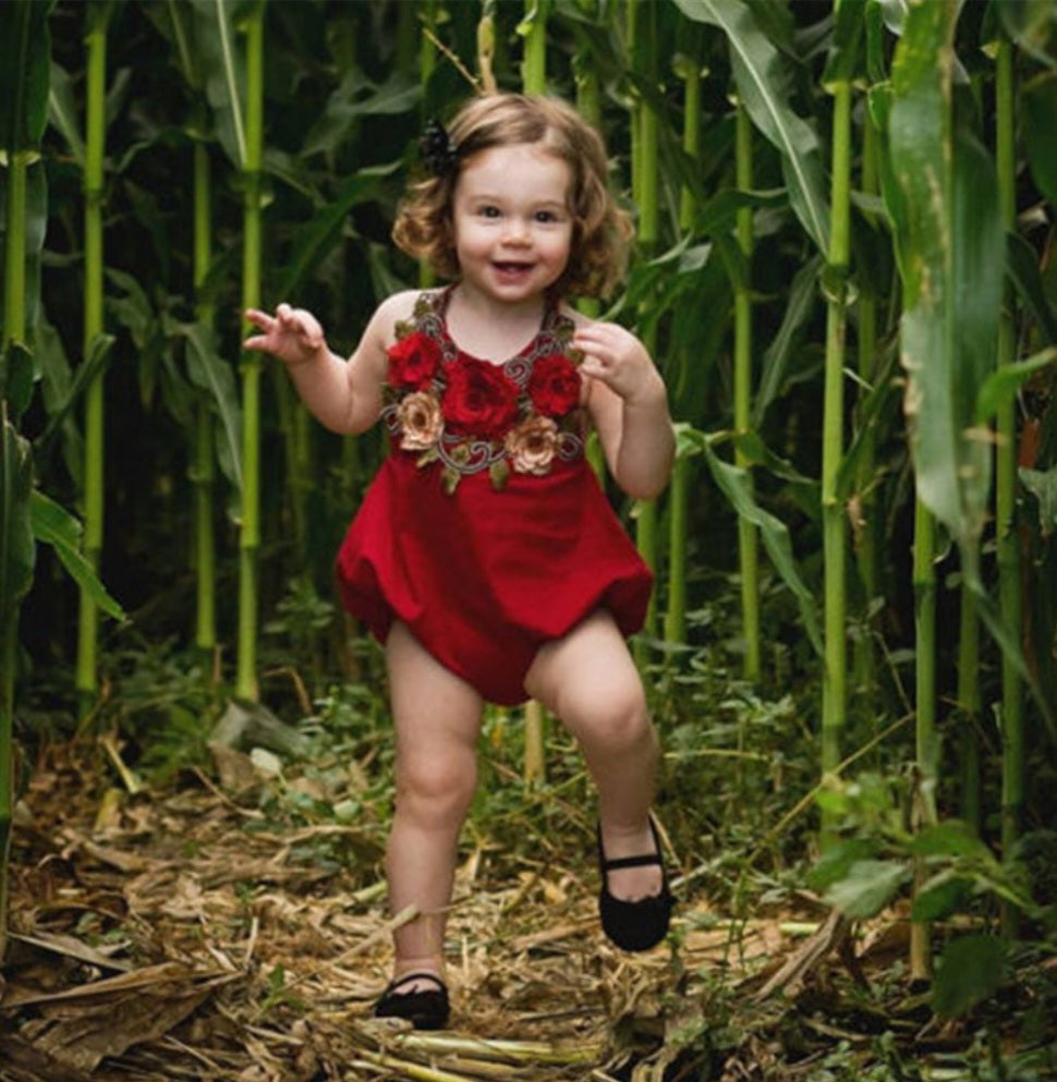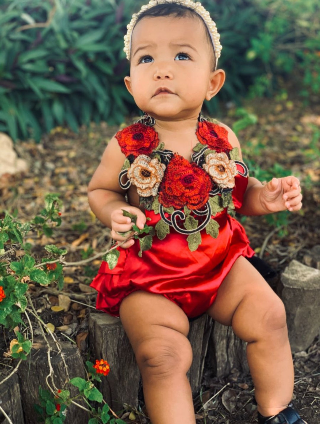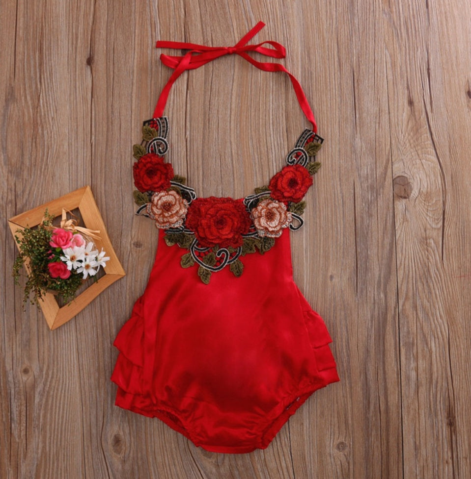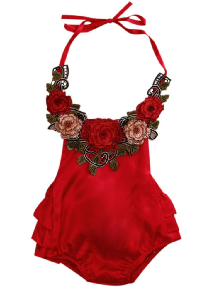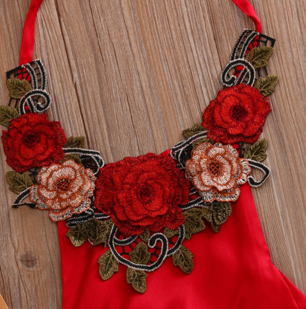 Red Silk Romper With Roses ( Also Available in Halterneck Dress)