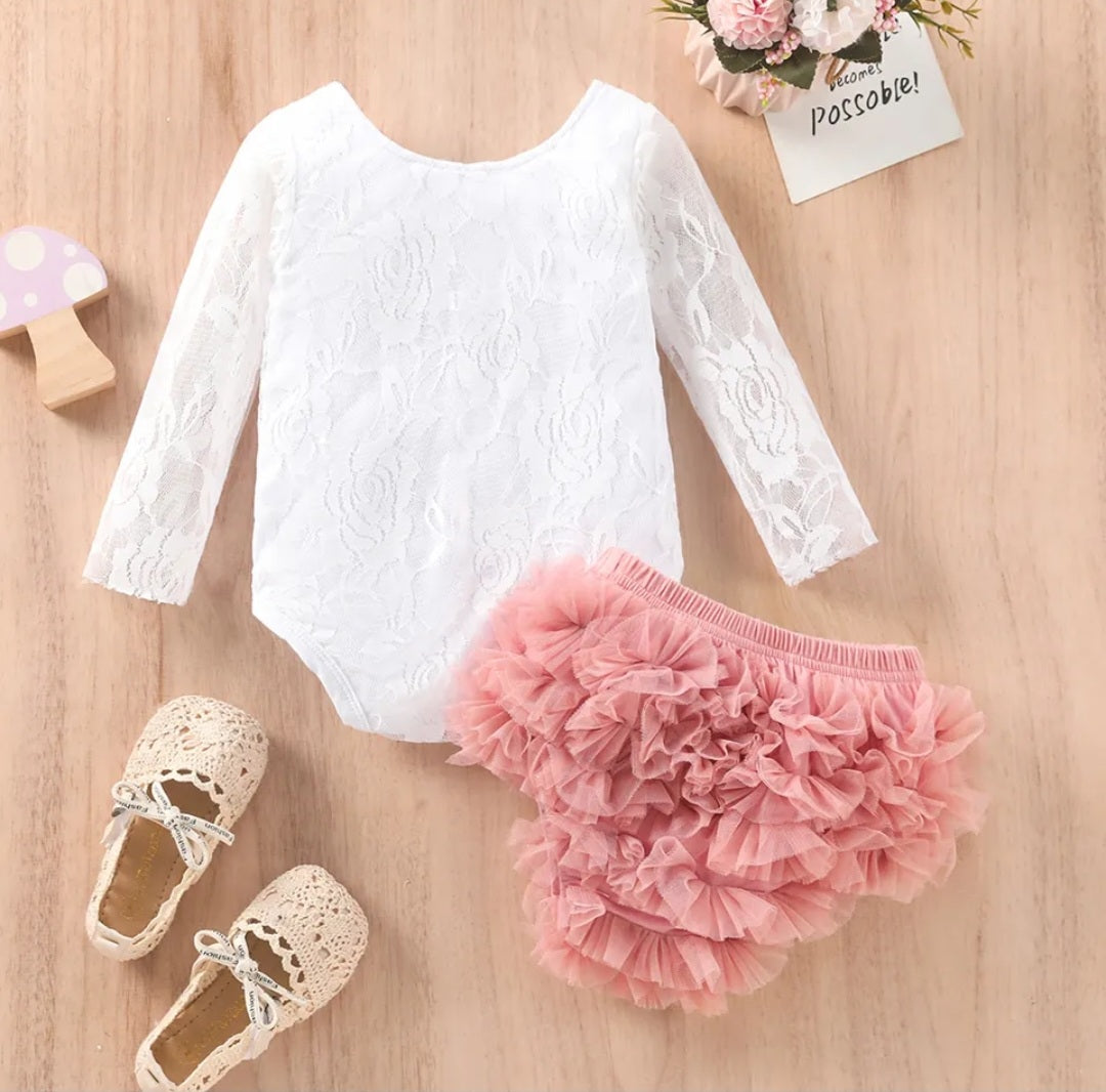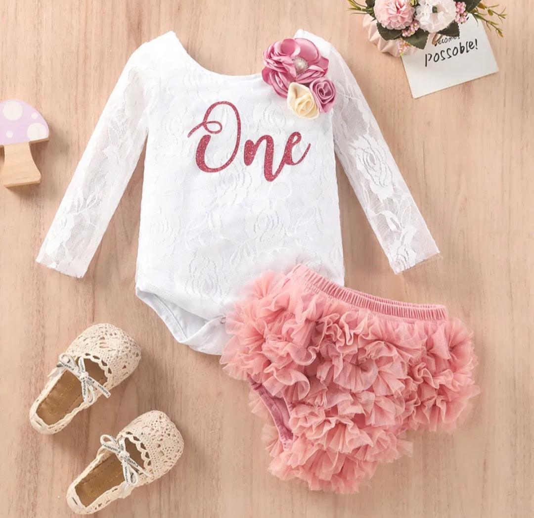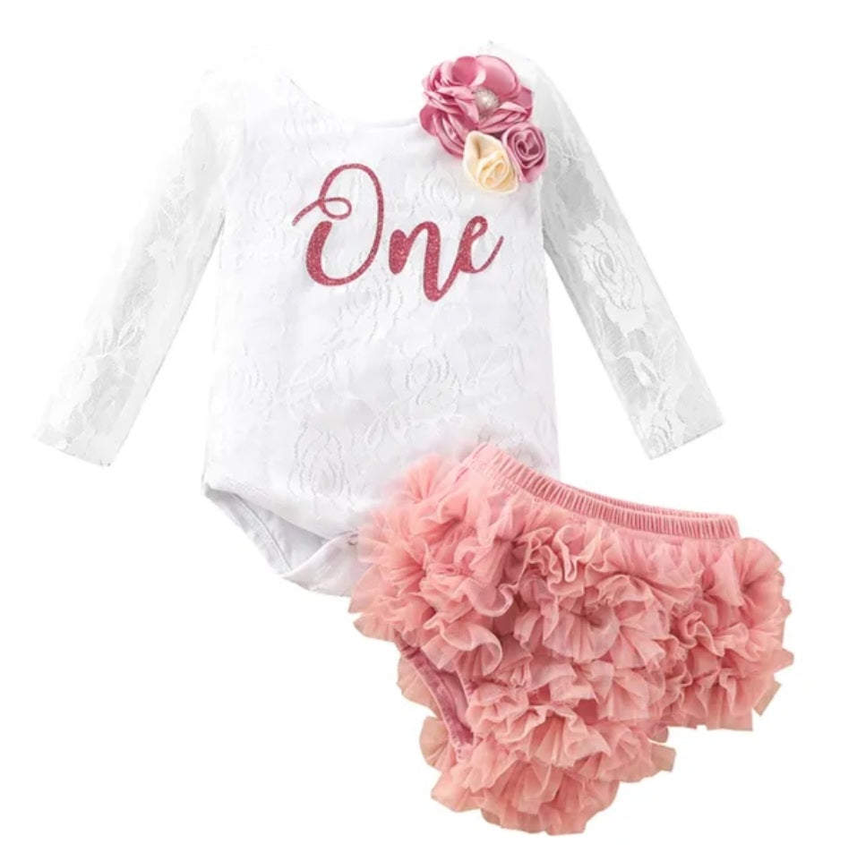White Lace Birthday Romper with Lace Bloomer #1000521