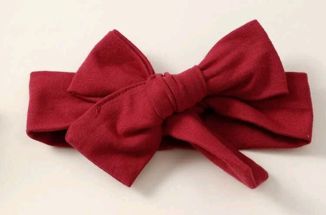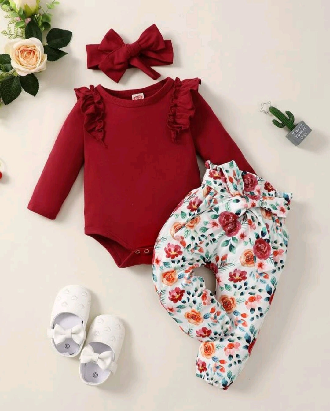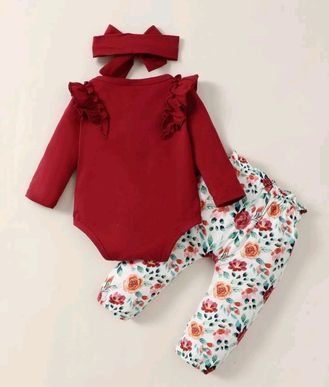Maroon Long Sleeve Romper with Floral Bowknot Pants and Headband