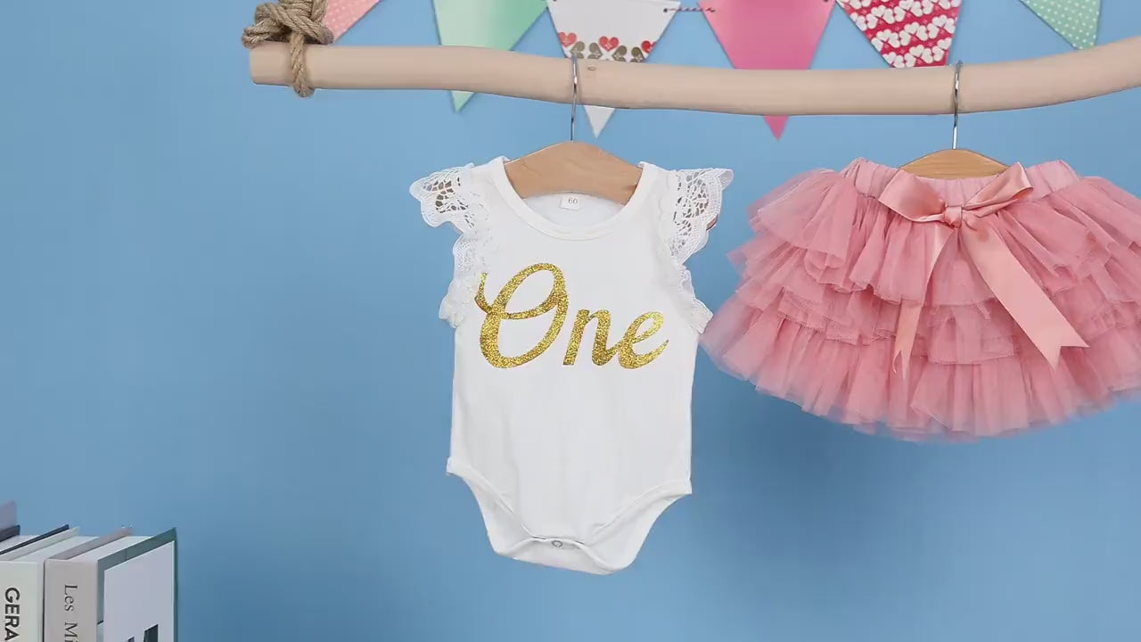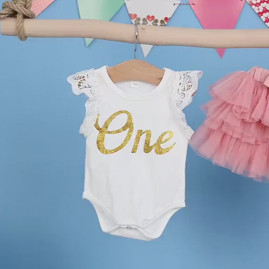 One Ruffle Lace Romper with Tutu Bloomer and Headband