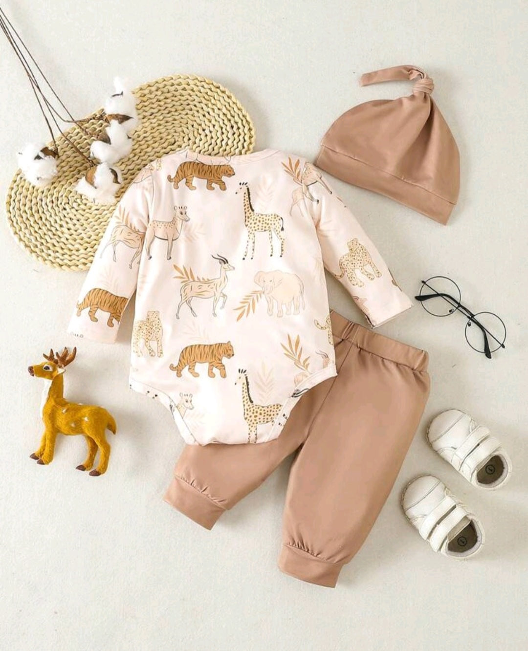 Safari Long Sleeve Romper with Monochrome Pants and Pumpkin Hat Gender Neutral