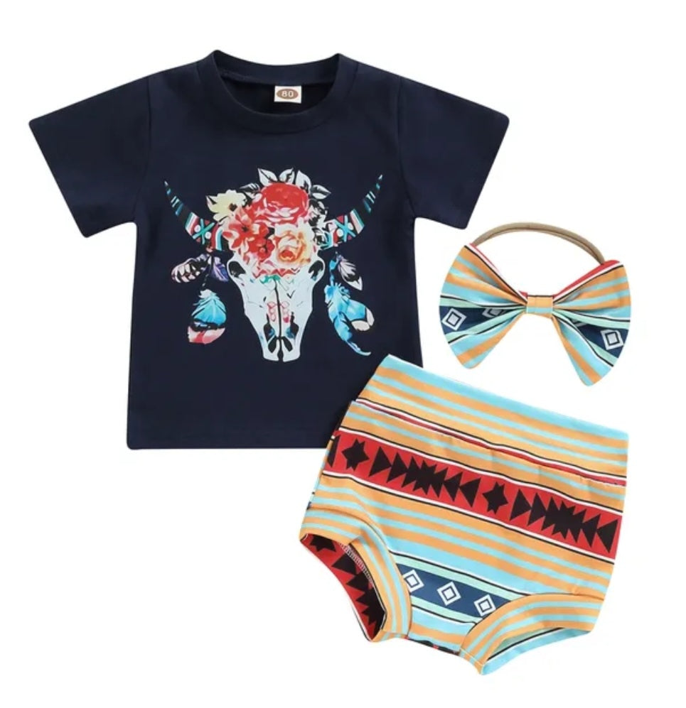 Bucramium, Navy Boho Cow Skull T-shirt Bloomer and Headband